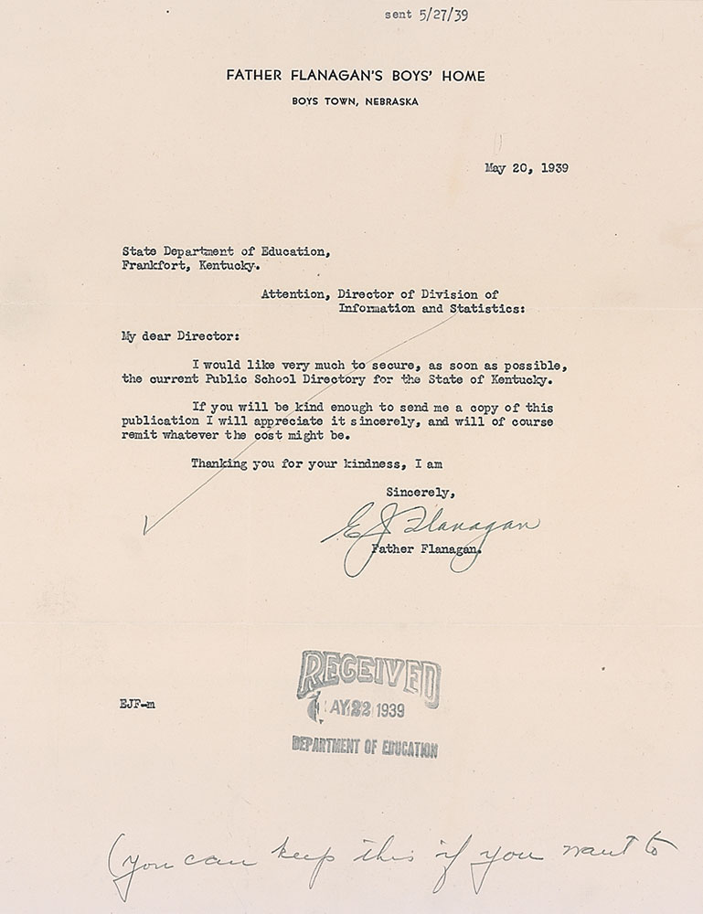 TLS signed “E. J. Flanagan,” one page, 8.5 x 11, Father Flanagan’s Boys’ Home letterhead, May 20, 1939. Letter to the director of the Kentucky Department of Education. In part: “I would very much like to secure, as soon as possible, the current Public School Directory for the State of Kentucky. If you will be kind enough to send me a copy of this publication I will appreciate it sincerely.” Letter bears a few office stamps and notations. In fine condition, with intersecting folds. Accompanied by the original mailing envelope. RR Auction COA.