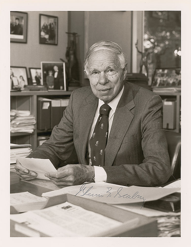 Nobel Prize–winning chemist (1912–1999) who was instrumental in the discovery of several elements. Glossy 8.5 x 11 photo of Seaborg behind his desk, signed in black ballpoint, “Glenn T. Seaborg.” In very fine condition. RR Auction COA.