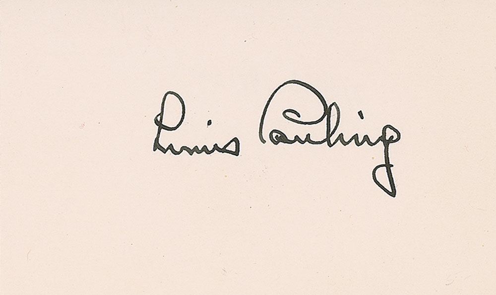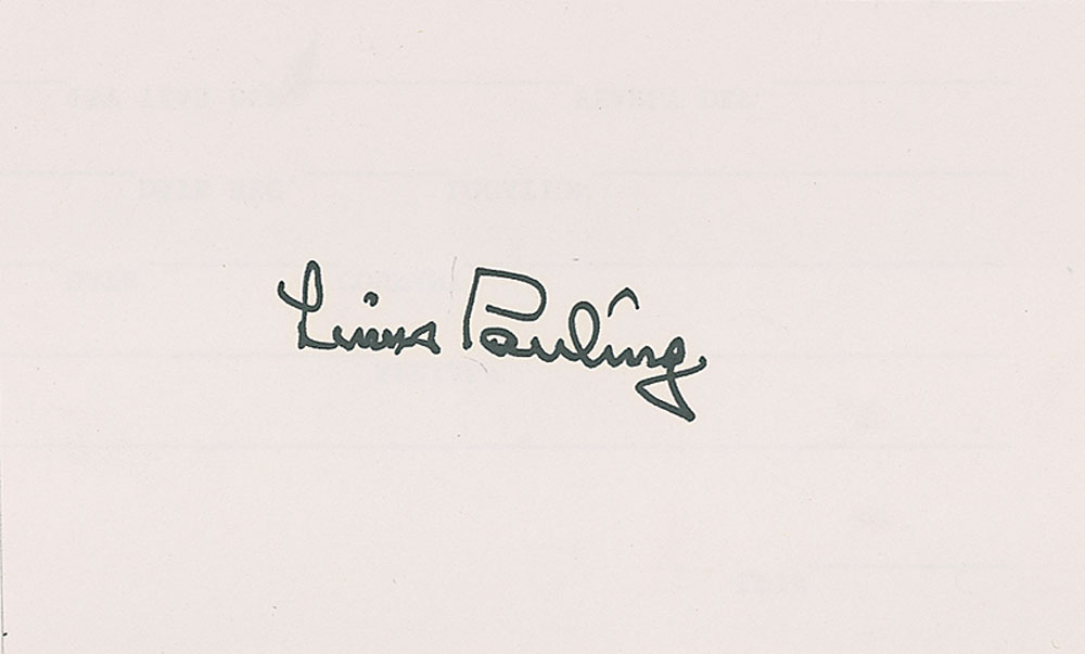 Three items: glossy 5 x 7 photo of Pauling wearing a hat and smiling, signed in blue felt tip; and two felt tip signatures, “Linus Pauling,” on individual off-white cards. In overall fine condition. RR Auction COA.
