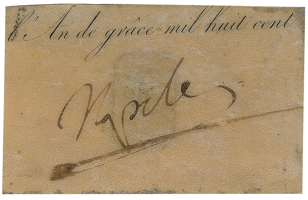 Ink signature, “Napole,” on an off-white 3.25 x 2 laminated vellum slip clipped from a larger document. In very good condition, with show-through from a small image affixed to reverse, uniform toning, and aforementioned lamination. RR Auction COA.