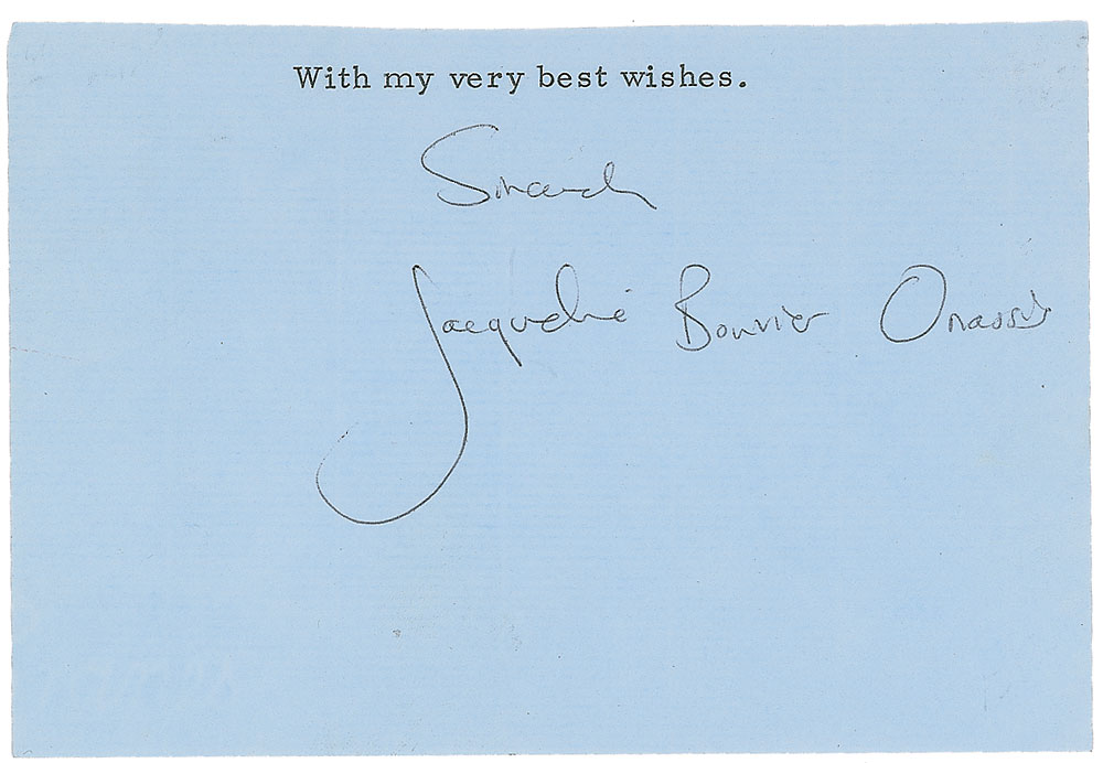 Ballpoint signature, “Sincerely, Jacqueline Bouvier Onassis,” on a light blue 5.25 x 3.5 slip clipped from the closing of a letter. In fine condition. RR Auction COA.