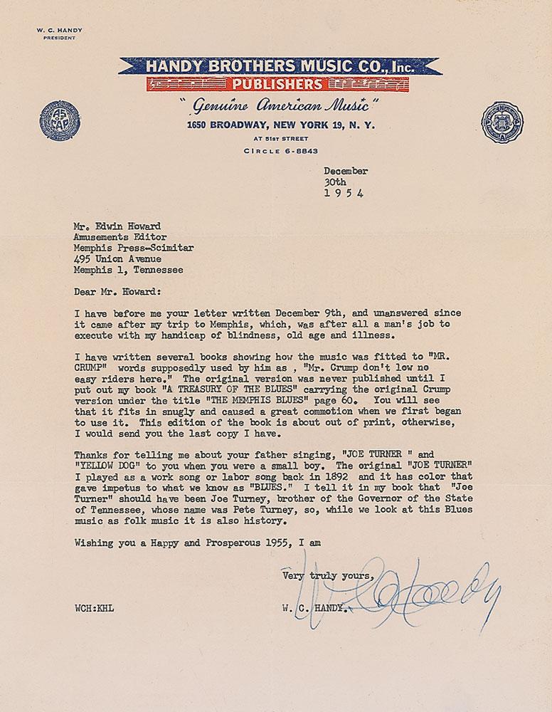 TLS, one page, 8.5 x 11, Handy Brothers Music Co., Inc. letterhead, December 30, 1954. Letter to arts and entertainment editor Edwin Howard. In part: “I have written several books showing how the music was fitted to ‘Mr. Crump’ words supposedly used by him as, ‘Mr. Crump don’t low no easy riders here.’ The original version was never published until I put out my book ‘A Treasury Of The Blues’ carrying the original Crump version under the title ‘The Memphis Blues’…Thanks for telling me about your father singing ‘Joe Turner’ and ‘Yellow Dog’ to you when you were a small boy. The original ‘Joe Turner’ I played as a work song or labor song back in 1892 and it has color that gave impetus to what we know as ‘Blues.’” In fine condition, with intersecting mailing folds. Pre-certified PSA/DNA and RR Auction COA.