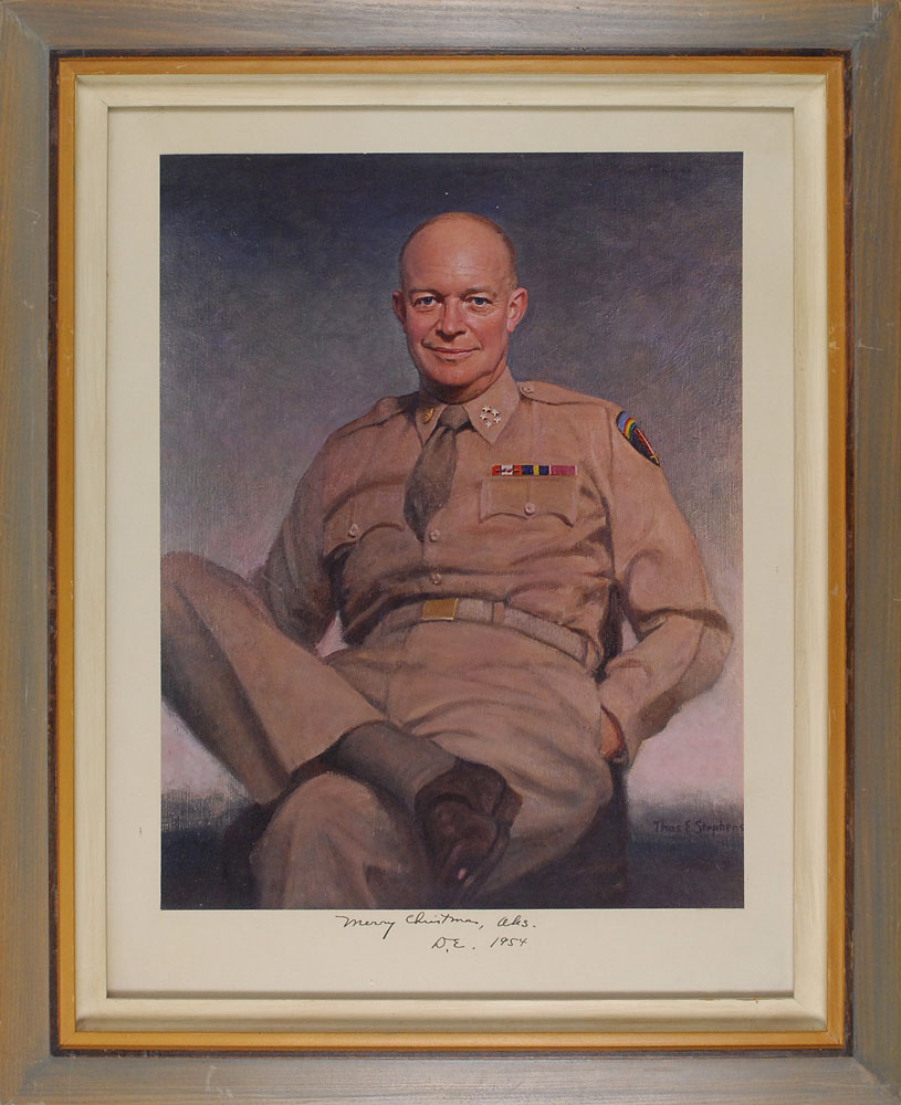 Giant color vintage 15 x 19.25 portrait of Five-Star General and Supreme Commander Eisenhower affixed to its original 17.5 x 22.75 mount, signed and inscribed on the mount in fountain pen, “Merry Christmas, Aks. D. E., 1954.” The original was painted by Thomas E. Stephens, Eisenhower’s friend and a renowned portrait painter, primarily of iconic American figures. Framed to an overall size of 23 x 28. In fine condition. Ike presented this massive portrait to his close friend and financial adviser, Aksel Nielsen, a philanthropist who served under him on the Advisory Commission on Government Housing Policies and Programs, as well as the Civil and Defense Mobilization Board. Especially appealing because of these close personal associations, this is without a doubt one of the most impressive Eisenhower portraits we have encountered. Oversized. Pre-certified John Reznikoff/PSA/DNA and RR Auction COA.