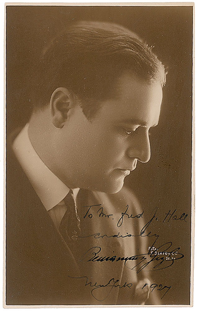 Legendary Italian tenor (1890–1957) who takes a place among the most revered operatic artists of all time. Vintage 3.25 x 5.25 postcard photo, signed and inscribed in fountain pen, “To Mr. Fred J. Hall, Cordially, Beniamino Gigli, New York, 1927.” In fine condition. RR Auction COA.
