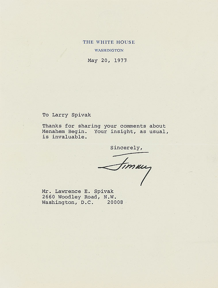 TLS signed “Jimmy,” one page, 6.75 x 8.75, White House letterhead, May 20, 1977. Letter to Lawrence Spivak, cofounder of Meet the Press. In full: “Thanks for sharing your comments about Menahem [sic] Begin. Your insight, as usual, is valuable.” In very fine condition. Accompanied by a copy of Spivak’s initial letter, in part: “If Menahem [sic] Begin becomes Prime Minister of Israel, I think he may offer more of an opportunity for peace than a peril to it…He has softened considerably since his days in the Irgun. Not only that, but his heart attack and his age can, I believe, make him think more about a place in history as a peacemaker than as a hawk. If he should recognize the importance of compromise, it will be easier for him to sell the Israelis than it would be for a Prime Minister who is more dovish.” Pre-certified PSA/DNA and RR Auction COA.