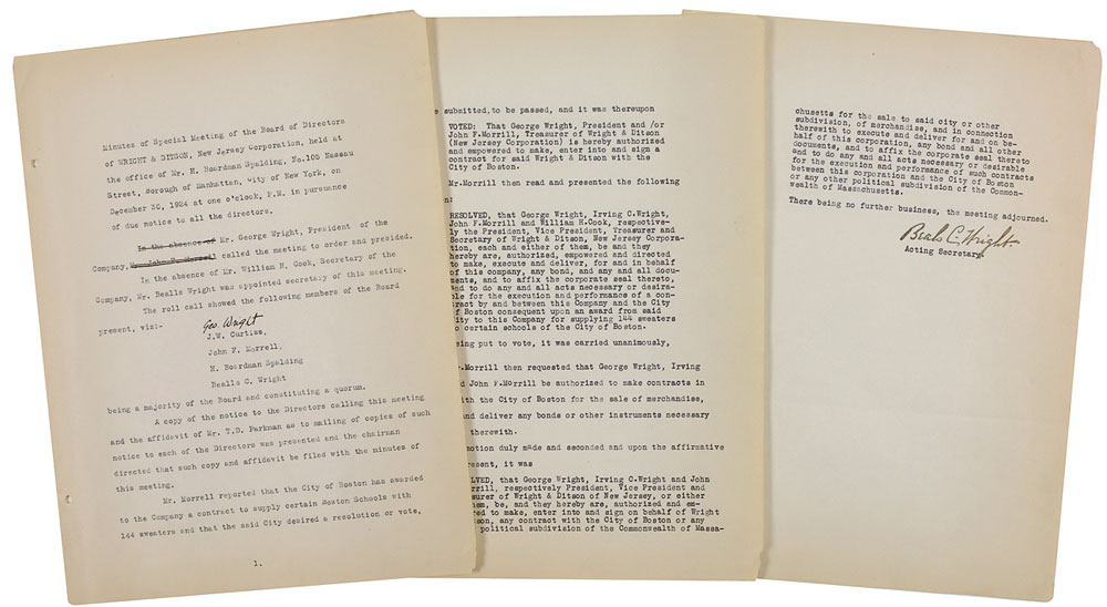 American tennis player (1879–1961) who won gold medals in both the singles and doubles competitions at the 1904 Olympic Games. Wright was inducted into the International Tennis Hall of Fame in 1956. Rare DS, signed “Beals C. Wright,” three pages, 9 x 11.75, December 30, 1924. Minutes of a meeting of the board of directors of Wright & Ditson. In part: “Mr. Morrell [sic] reported that the City of Boston has awarded to the Company a contract to supply certain Boston Schools with 144 sweaters…George Wright, President and/or John F. Morrill…is hereby authorized and empowered to make, enter into and sign a contract for said Wright & Ditson with the City of Boston.” Boldly signed at the conclusion by Beals Wright as acting secretary. In fine condition, with expected document wear. Pre-certified Steve Grad/PSA/DNA and RR Auction COA.