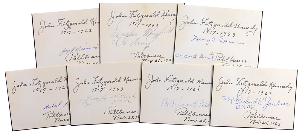 Seven vintage ballpoint signatures of Kennedy’s pallbearers on on individual black-bordered custom 5 x 3.75 collector’s cards. Signers are: George A. Barnum (Coast Guard), Richard E. Gaudreau (Air Force), James L. Felder (Army), Jerry J. Diamond (Marines), Douglas A. Mayfield (Army), Hubert Clark (Navy), and Timothy F. Cheek (Marines). Felder also enclosed a brief ALS responding to the original autograph request. In overall fine condition. All are accompanied by their original mailing envelopes, postmarked during the spring of 1966. RR Auction COA.