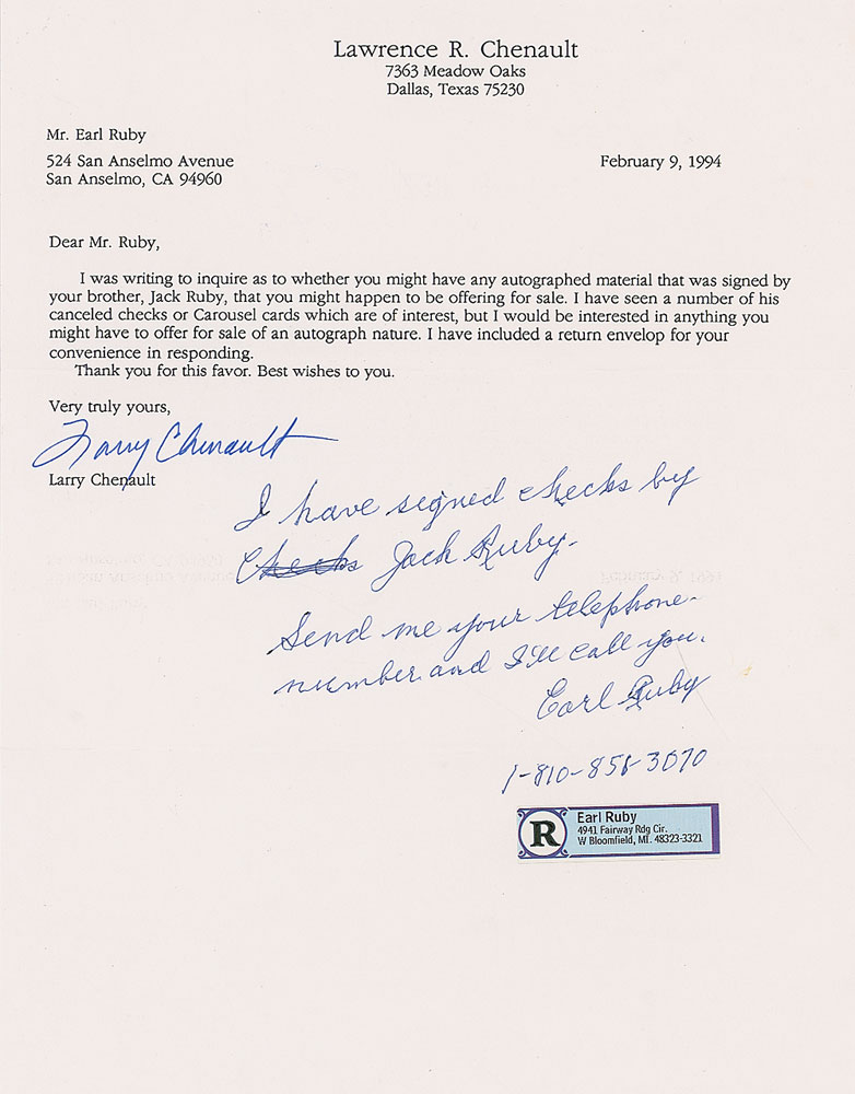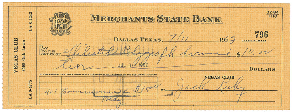 Vegas Club business check, 8.25 x 3, filled out and signed by Ruby, payable to Affiliated Polygraph Service for $10.00, July 11, 1962. In fine condition, with a few vertical folds (two passing through letters of the signature). Accompanied by a brief ALS from his brother Earl Ruby, regarding Ruby items for sale. RR Auction COA.