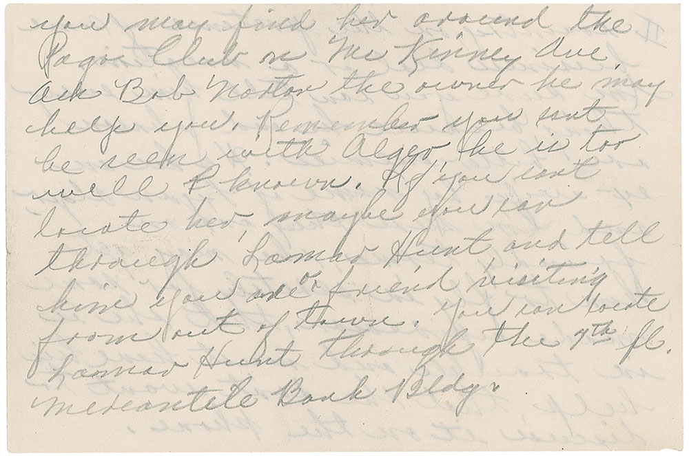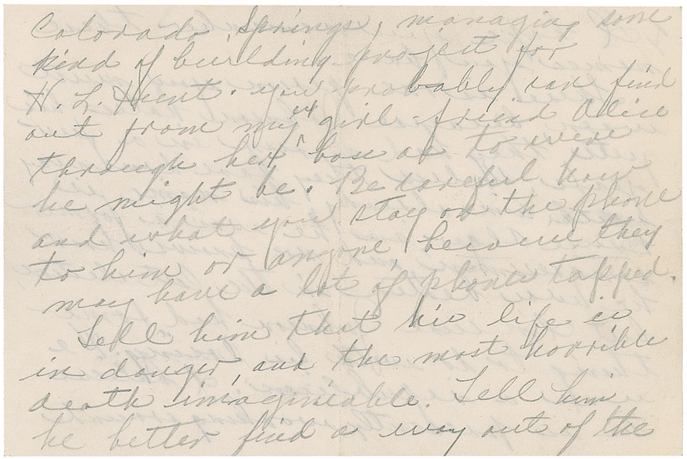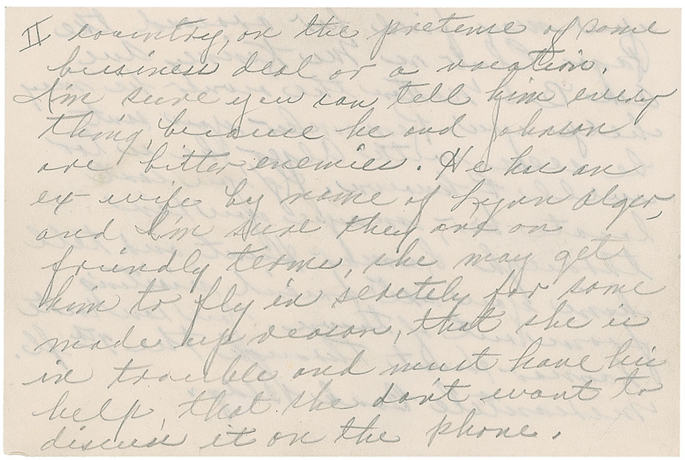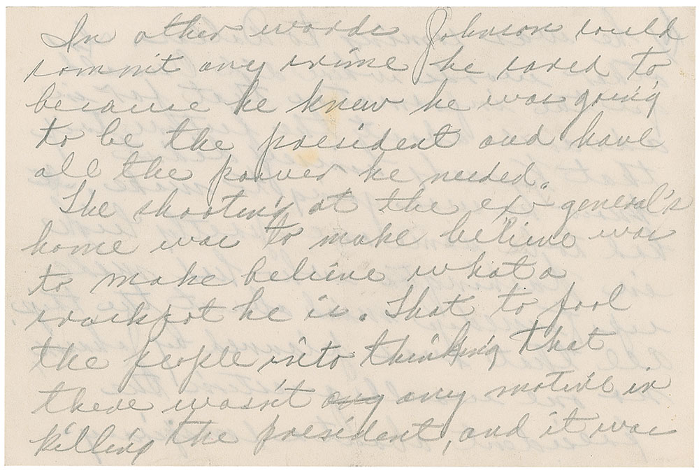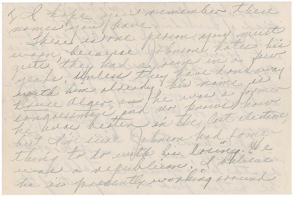 Unsigned autograph letter in pencil, five pages both sides, 6 x 4, no date but circa 1965. Letter to Thomas E. Miller, a fellow inmate in Dallas County Jail. In part: "I hope you remember these names you have. There is one person you must warn, because Johnson hates his guts…his name is Bruce Alger, he was a former congressman, and no one knows how he was beaten in the last election but I’m sure Johnson had something to do with his losing. He was a republican. I believe he is presently working around Colorado Springs managing some kind of building project for H. L. Hunt. You probably can find out from my ex girl friend Alice…Be careful how and what you stay [sic] on the phone to him or anyone, because they may have a lot of phones tapped. Tell him that his life is in danger, and the most horrible death imaginable. Tell him he better find a way out of the country…Remember—you can't be seen with Alger, he is too well known. Maybe you can [locate him] through Lamar Hunt…