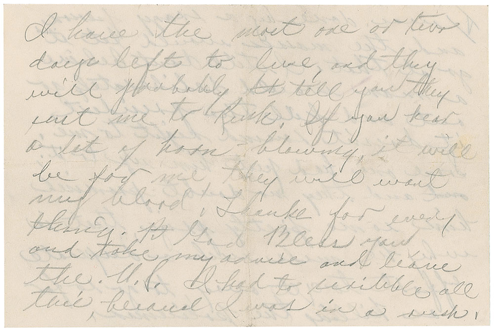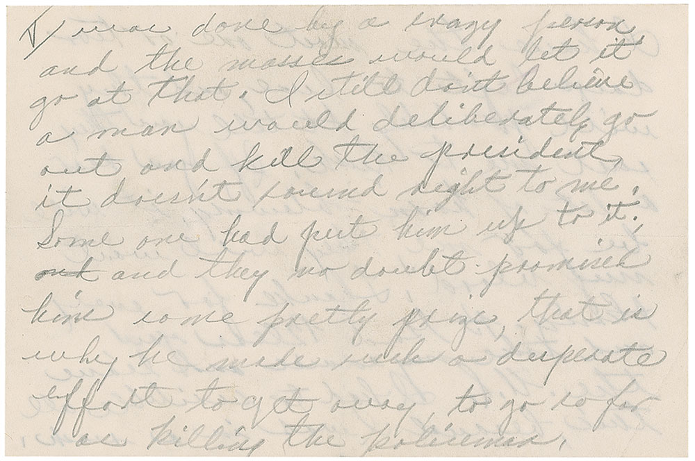 The shooting at the ex-general's [Edwin Walker] home was to make believe…what a crackpot he [Oswald] is. That to fool the people into thinking that there wasn't any motive in killing the president, and it was done by a crazy person…I still don't believe that a man would deliberately go out and kill the president, it doesn’t sound right to me. Some one had put him [Oswald] up to it, and they no doubt promised him some pretty prize, that is why he made such a desperate effort to get away, to go so far as killing the policeman [J .D. Tippett]. I have [at] the most one or two days left to live…If you hear a lot of horn-blowing it will be for me, they will want my blood!…take my advice and leave the US." In fine condition, with a central vertical fold to each page and a couple tiny stains to one page. Accompanied by a letter of provenance from the original recipient, as well as two letters related to the piece from Charles Hamilton, who initially sold it in 1966.