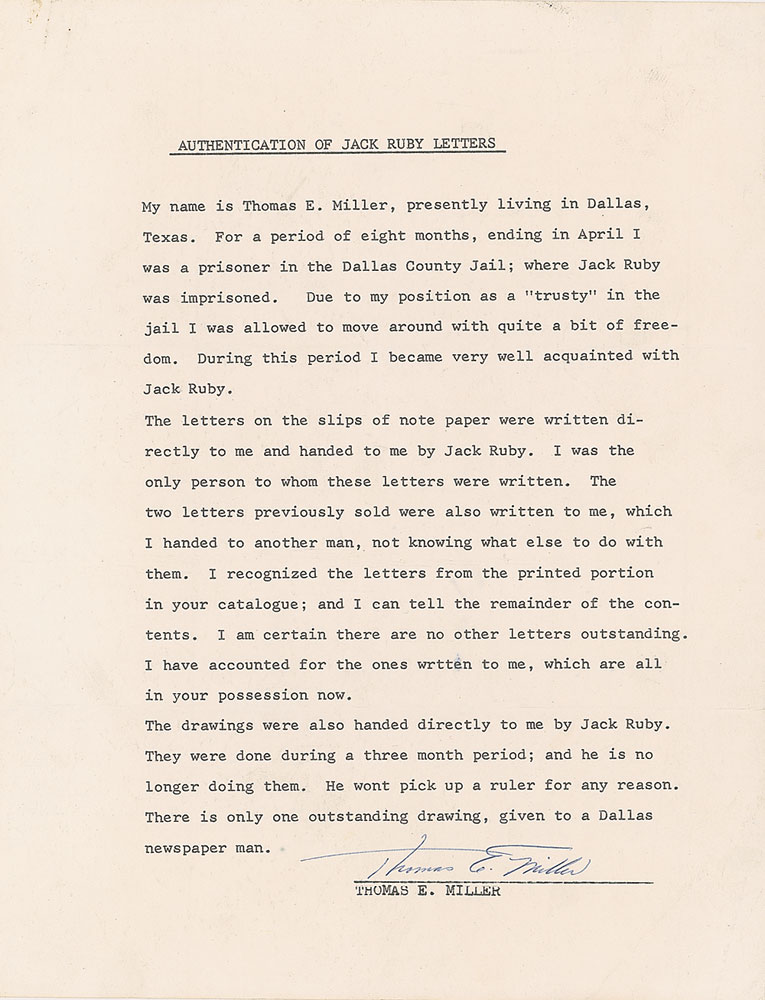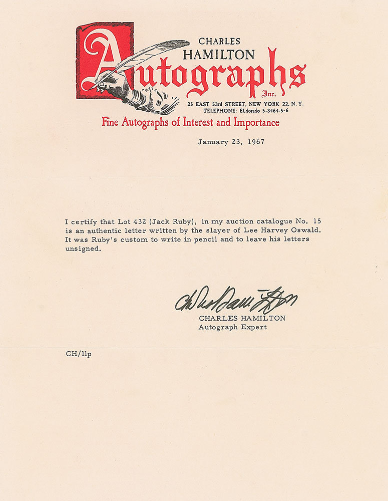 Smuggled out of a Dallas Jail cell in 1965, this famous letter from Oswald’s killer—pointing to President Johnson as the brains behind the assassination, implying that he set the scene and put Oswald into position on that fateful day in November—immediately sparked interest when it went up for auction by New York dealer Charles Hamilton in 1966. Bought by Penn Jones, editor of a small newspaper in East Texas, it was excerpted and published in the May 1966 book, Forgive My Grief, a compilation of his editorials on the assassination. Coinciding with an erosion of public confidence in the Warren Report and concern over the drastic changes in US policy (especially in regard to Vietnam) under the new president, Ruby’s rambling conspiracy claims held a ring of truth for some: “Also about Oswald who…suddenly decided to go to work in the book-binding building…where did Oswald get the information that far in advance…It had to be someone pretty high in Washington who had made up Kennedy's mind about the trip. All that was planned by Johnson, no one would question the president about a conspiracy.” A remarkable piece, capturing the fears and beliefs of the alleged assassin’s assassin. RR Auction COA.