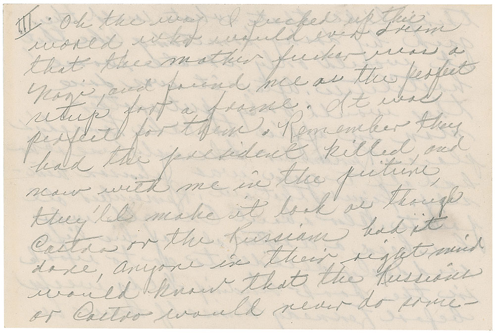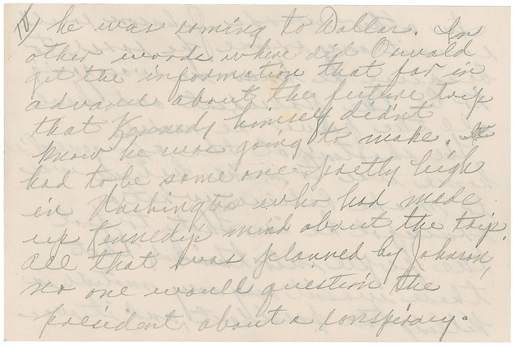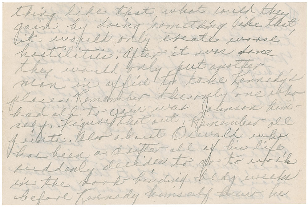 Oh the way I fucked up this world who would ever dream that the mother fucker was a Nazi, and found me as the perfect setup for a frame. It was perfect for them. Remember they had the president killed, and now with me in the picture, they'll make it look as though Castro or the Russians had it done. Anyone in their right mind would know that the Russians or Castro would never do something like that…it would only create worse hostilities. After it was done they would only put another man in office to take Kennedy’s place. Remember the only one who had all to gain was Johnson himself. Figure that out. Remember all points. Also about Oswald who has been a drifter all of his life, suddenly decided to go to work in the book-binding building weeks before Kennedy himself knew he was coming to Dallas…where did Oswald get the information that far in advance…It had to be someone pretty high in Washington who had made up Kennedy's mind about the trip. All that was planned by Johnson, no one would question the president about a conspiracy…Johnson could commit any crime he cared to because he knew he was going to be the president and have all the power he needed.
