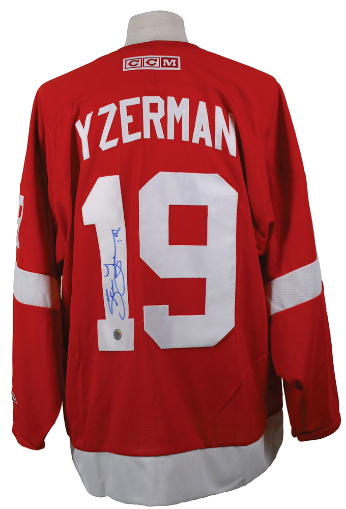 Official CCM replica Detroit Red Wings hockey jersey, with sewn on letters and numbers, signed in blue felt tip on the number on the back. In fine condition, with slight overall spreading to signature due to nature of material. Pre-certified Steve Grad/PSA/DNA and RR Auction COA.