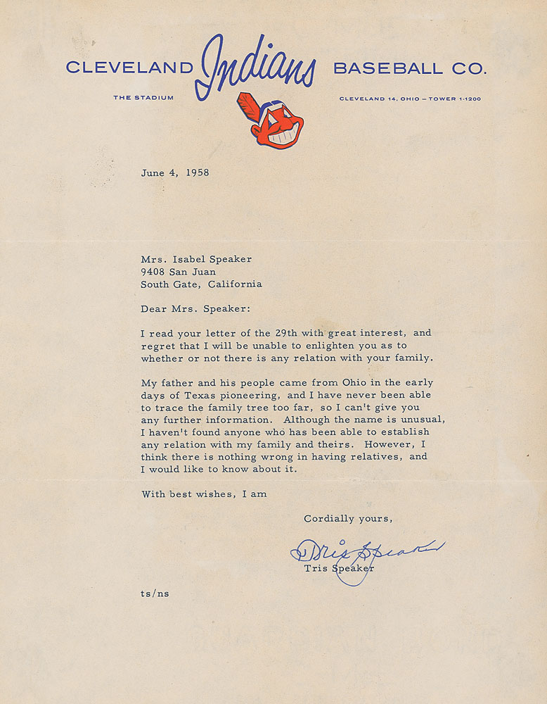 TLS, one page, 8.5 x 10.75, Cleveland Indians letterhead, June 4, 1958. Letter to Isabel Speaker of California. In part: “I will be unable to enlighten you as to whether or not there is any relation with your family. My father and his people came from Ohio in the early days of Texas pioneering, and I have never been able to trace the family tree too far, so I can’t give you any further information. Although the name is unusual, I haven’t found anyone who has been able to establish any relation with my family and theirs. However, I think there is nothing wrong in having relatives, and would like to know about it.” Affixed to a same-size scrapbook page. In fine condition, with a paperclip impression to the upper left corner and a couple small areas of subtle foxing. Pre-certified Steve Grad/PSA/DNA and RR Auction COA.