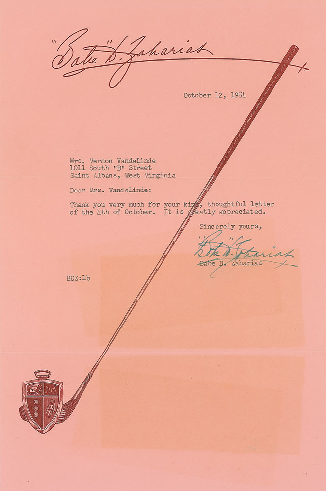 TLS signed “‘Babe’ D. Zaharias,” one page, 7 x 10.5, personal letterhead, October 12, 1954. Brief letter to an admirer. In full: “Thank you very much for your kind, thoughtful letter of the 4th of October. It is greatly appreciated.” Two moderate blocks of toning to the lower portion (affecting the bottom of the signature), otherwise fine condition. Accompanied by the original mailing envelope and a newspaper clipping. Pre-certified Steve Grad/PSA/DNA and RR Auction COA.