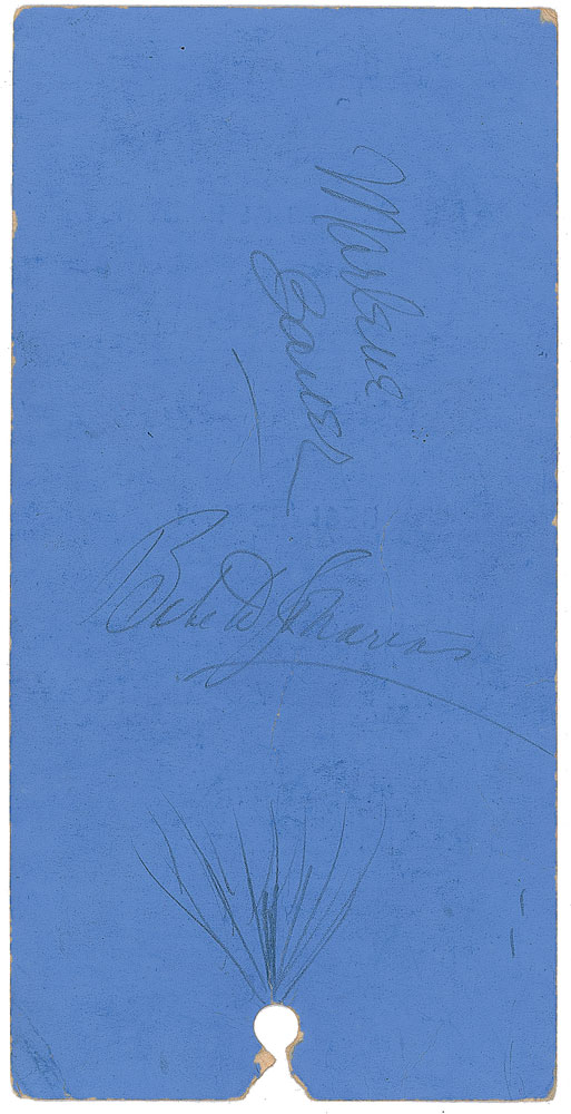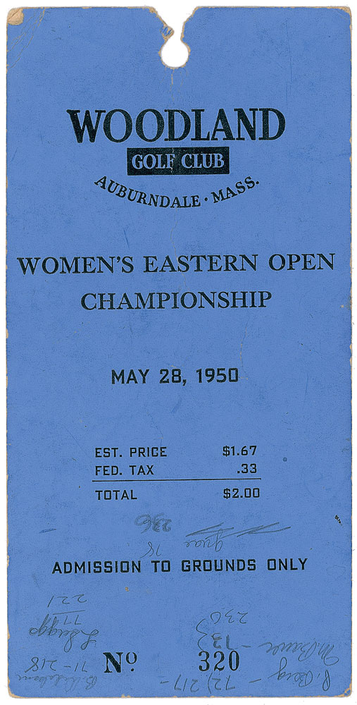 Vintage admission pass to the Woodland Golf Club in Auberndale, Massachusetts, for the Women’s Eastern Open Championship, May 28, 1950, 3 x 6.25, signed on the reverse in pencil, “Babe D. Zaharias.” Also signed in pencil by golfer Marlene Bauer. In very good condition, with various pencil notations to both sides, and a bit of paper loss to top edge. Pre-certified Steve Grad/PSA/DNA and RR Auction COA.