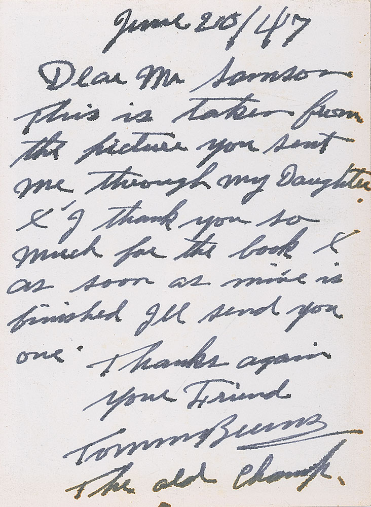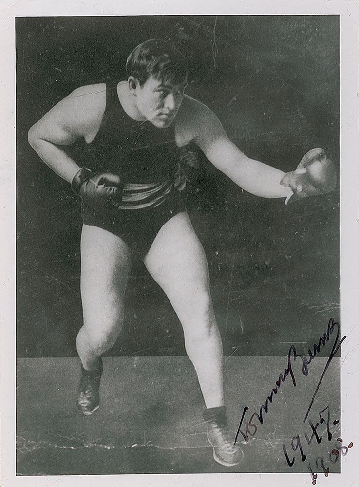 Boxing Hall of Famer (1881–1955) who was heavyweight boxing champion of the world from 1906 through 1908. Vintage glossy 3.75 x 5 photo of Burns in a pugilistic pose, signed in fountain pen, “Tommy Burns, 1947, 1908.” Burns also penned an ALS on the reverse of the photo, signed “Tommy Burns, The Old Champ,” dated June 20, 1947, in part: “This is taken from the picture you sent me through my daughter.” A couple diagonal creases to the top, otherwise fine condition. Pre-certified Steve Grad/PSA/DNA and RR Auction COA.