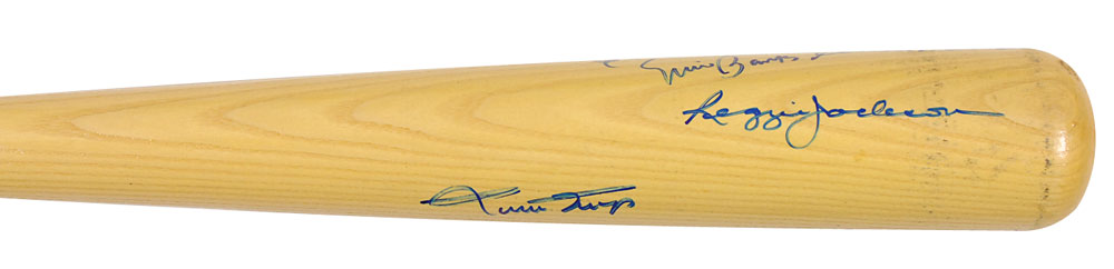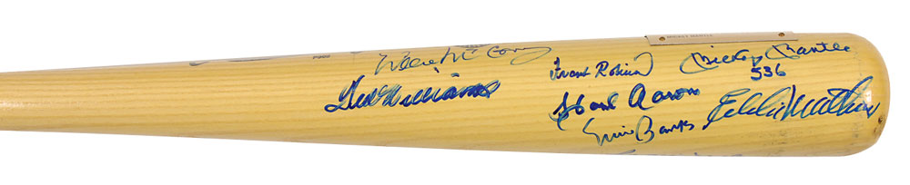 Official limited edition Rawlings Adirondack commemorative baseball bat, with a plaque affixed near the end of the barrel, numbered 166/300, signed in blue felt tip on the barrel by 11 members of the 500 Home Run Club: Hank Aaron, Ted Williams, Willie Mays, Mickey Mantle, Willie McCovey, Mike Schmidt, Harmon Killebrew, Frank Robinson, Ernie Banks, Eddie Mathews, and Reggie Jackson. In fine condition. Pre-certified Steve Grad/PSA/DNA and RR Auction COA.