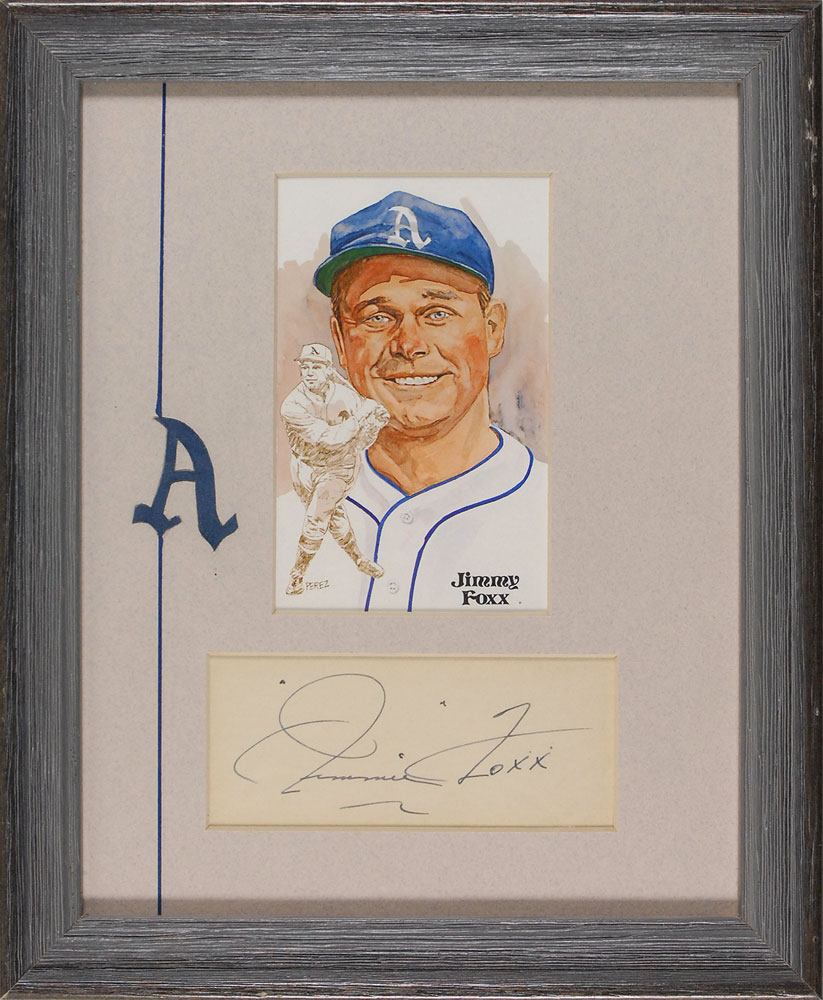 Vintage fountain pen signature, “Jimmie Foxx,” on an off-white 4.75 x 2 slip. Nicely custom-matted and framed with a Perez-Steele card of Foxx to an overall size of 9.5 x 11.5. In fine condition. Pre-certified Steve Grad/PSA/DNA and RR Auction COA.