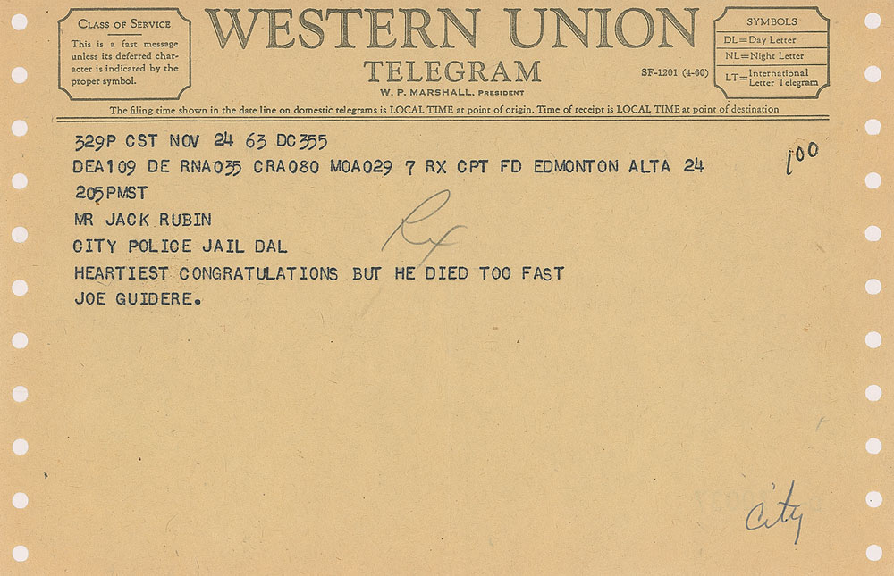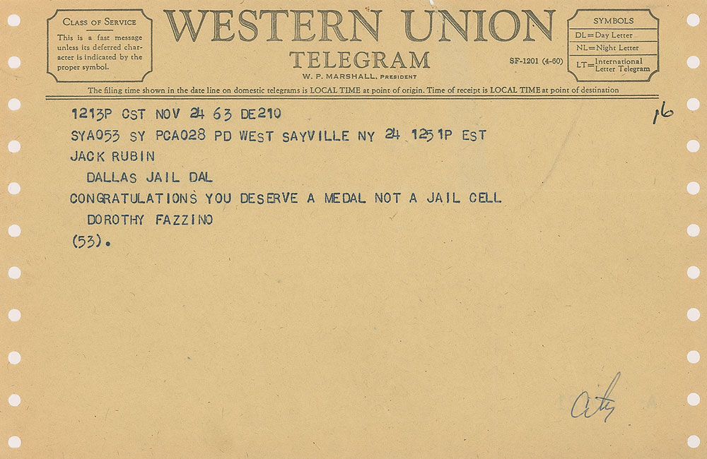 Two original Western Union typed telegrams sent to “Jack Rubin” at the Dallas City Jail, each one page, 8.5 x 5.5, November 24, 1963. First was sent by Dorothy Savino, in full: “Congratulations you deserve a medal not a jail cell.” Second was sent by Joe Guidere, in full: “Heartiest congratulations but he died too fast.” In overall fine condition. RR Auction COA.