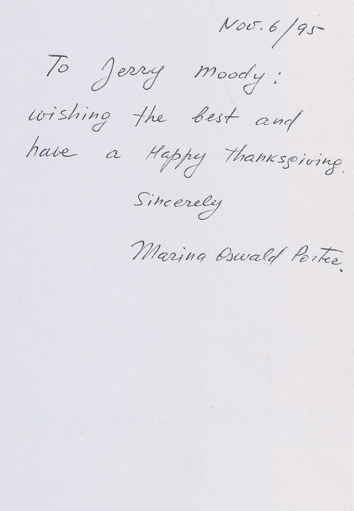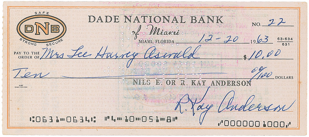 Personal check, 6.25 x 2.75, filled out and signed by R. Kay Anderson, payable to Mrs. Lee Harvey Oswald for $10, December 20, 1963, endorsed on the reverse by Oswald, “Mrs. Lee Harvey Oswald”; and a brief ALS signed “Marina Oswald Porter,” inside a 4.5 x 6.5 floral greeting card, November 6, 1995, in full: “Wishing the best and have a happy Thanksgiving.” In overall fine condition, with expected cancellation holes to check (not affecting signature). Accompanied by the original mailing envelope for the card filled out in Oswald’s hand, as well as a vintage pre-printed thank-you note from 1964. RR Auction COA.