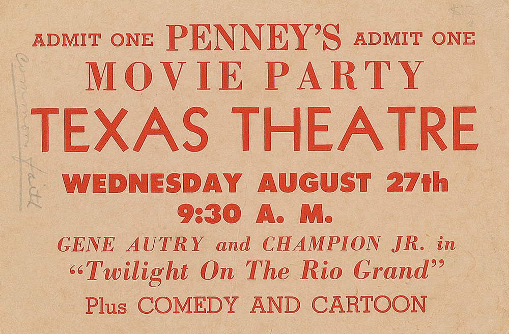 Original pass for admission to “Penney’s Movie Party” at the Texas Theatre, 6 x 4, where they were screening “Twilight on the Rio Grand [sic],” featuring Gene Autry. In very good condition, with a noticeable central vertical crease, pencil notation to left side, and numerous notations to reverse. Accompanied by two modern photos of the theatre. RR Auction COA.
