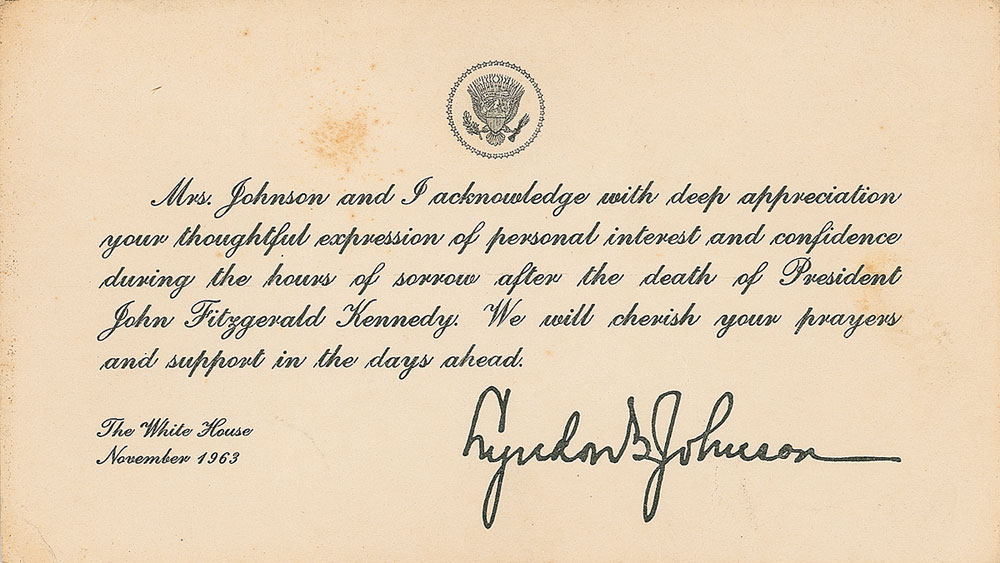 Original printed condolence card sent from the White House following Kennedy’s assassination, 6 x 3.5, bearing a printed facsimile of Lyndon B. Johnson’s signature at the bottom. In part: “Mrs. Johnson and I acknowledge with deep appreciation your thoughtful expression of personal interest and confidence during the sorrow after the death of President John Fitzgerald Kennedy.” In very good condition, with a central horizontal crease, crease to lower left corner, and a couple areas of foxing. RR Auction COA.
