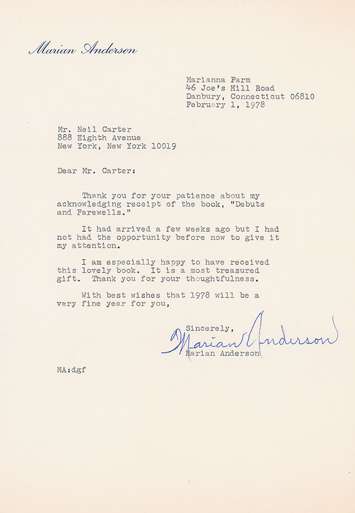 ALS, one page, 7.25 x 10.5, personal letterhead, February 1, 1978. Letter to Neil Carter. In part: “Thank you for your patience about my acknowledging receipt of the book, ‘Debuts and Farewells.’…It is a most treasured gift.” In fine condition. Accompanied by the original mailing envelope. RR Auction COA.