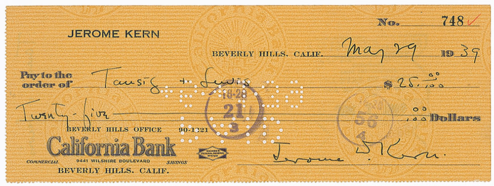 Personal check, 8.25 x 3, filled out and signed by Kern, “Jerome D. Kern,” payable to Tausig & Lewis for $25.00, May 29, 1939. In fine condition, with a central vertical fold and expected cancellation holes and bank stamps (one stamp touching the top of the signature). Pre-certified PSA/DNA and RR Auction COA.