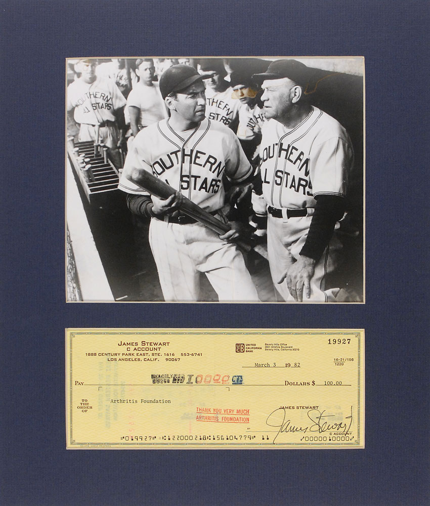 Check, 8.25 x 3.25, filled out in type and signed by Stewart, payable to Arthritis Foundation for $100.00, March 3, 1982. Matted with a glossy photo, from The Monty Stratton Story, to an overall size of 12 x 14. In fine condition, with a central vertical fold and expected stamps to both sides. Pre-certified PSA/DNA and RR Auction COA.