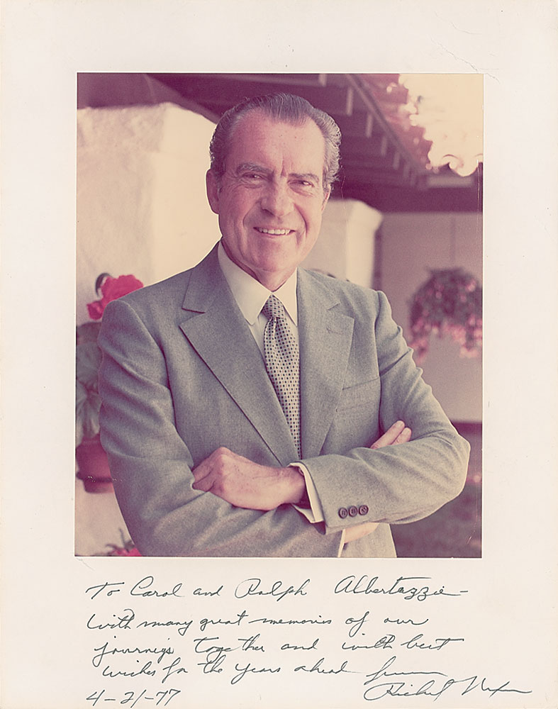 Color satin-finish 8 x 9.5 half-length portrait of Nixon affixed to its original 11 x 14 mount, signed and inscribed on the mount in black ink, “To Carol and Ralph Albertazzie—With many great memories of our journeys together and with best wishes for the years ahead, from Richard Nixon, 4-21-77.” Reverse of mount bears an official White House photograph stamp. Noticeable crease to the upper right corner of the mount, otherwise fine condition. Accompanied by an unsigned glossy press photo of Nixon aboard the personal plane of Chinese premier Chou en-Lai. Albertazzie was the pilot of Air Force One during the Nixon administration, who most notably flew the president on a historic trip to China. A fantastic association piece. Pre-certified John Reznikoff/PSA/DNA and RR Auction COA.