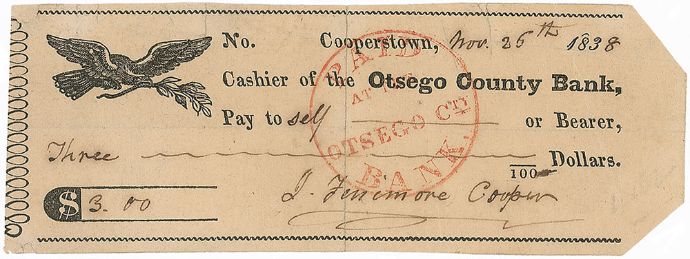 Otsego County Bank check, 5.75 x 2.25, filled out and signed by Cooper, “J. Fenimore Cooper,” payable to Self for $3.00, November 25, 1838. In very good condition, with a repair to central vertical fold passing through a single letter of signature, two clipped corners, and a bank stamp over middle portion of signature. RR Auction COA.
