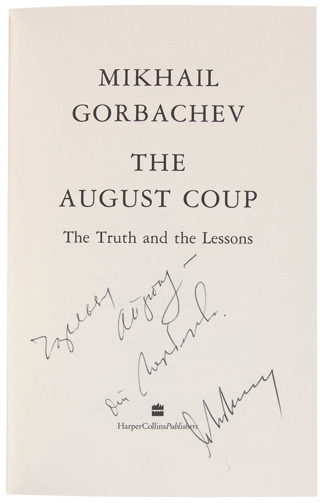 Signed book: The August Coup. First edition, first printing. NY: HarperCollins, 1991. Hardcover with dust jacket, 6.25 x 9.5, 127 pages. Signed and inscribed in black ink on the title page. In fine condition. RR Auction COA.