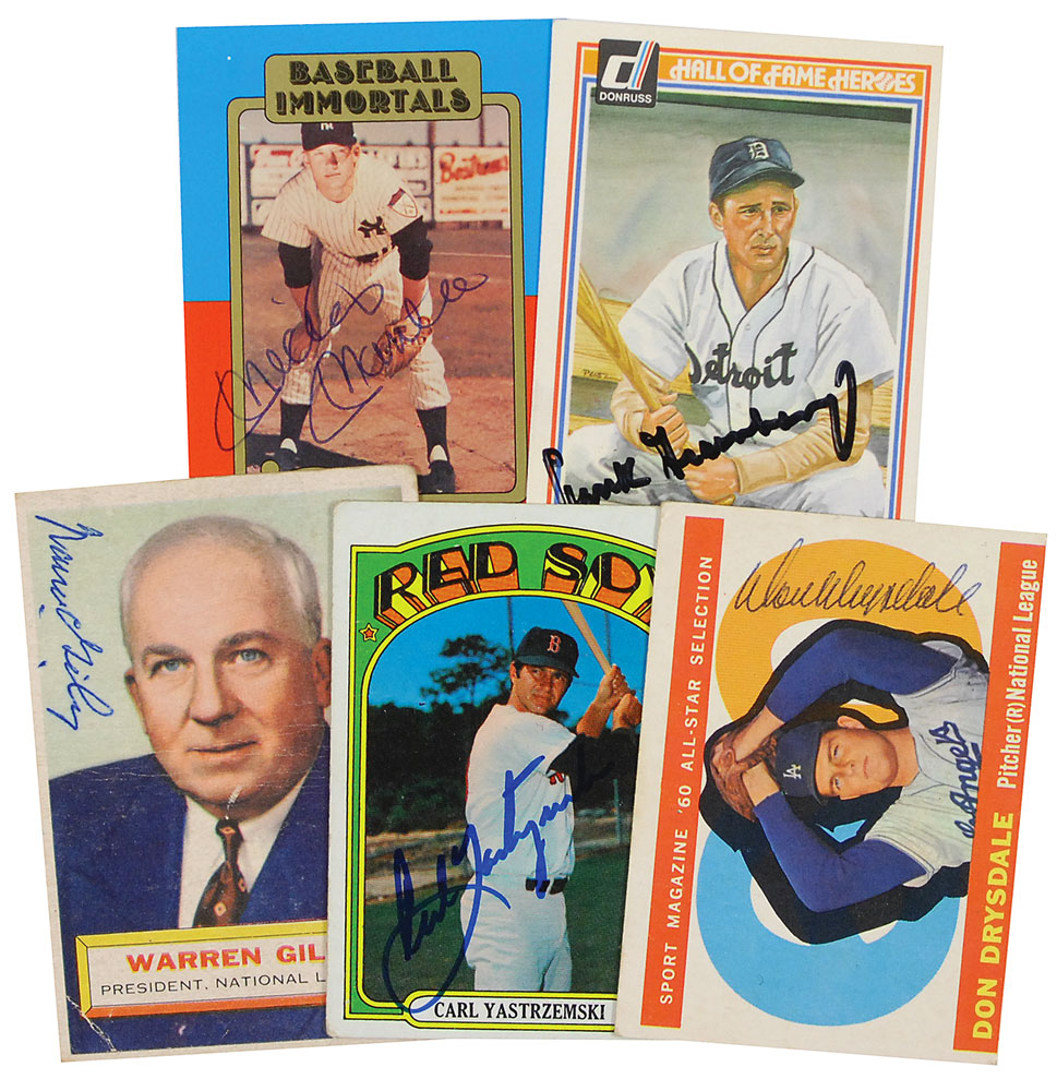 Five baseball cards, each signed by the Hall of Famer pictured: 1974 Baseball Immortals Mickey Mantle baseball card, signed in blue ballpoint; 1983 Donruss Hall of Fame Heroes Hank Greenberg baseball card, signed in black felt tip; 1972 Topps Carl Yastrzemski baseball card, signed in blue felt tip; 1960 Topps Don Drysdale baseball card, signed vertically in blue ballpoint; and a 1956 Topps Warren Giles baseball card, signed vertically in blue ballpoint. In overall very good to fine condition. RR Auction COA.