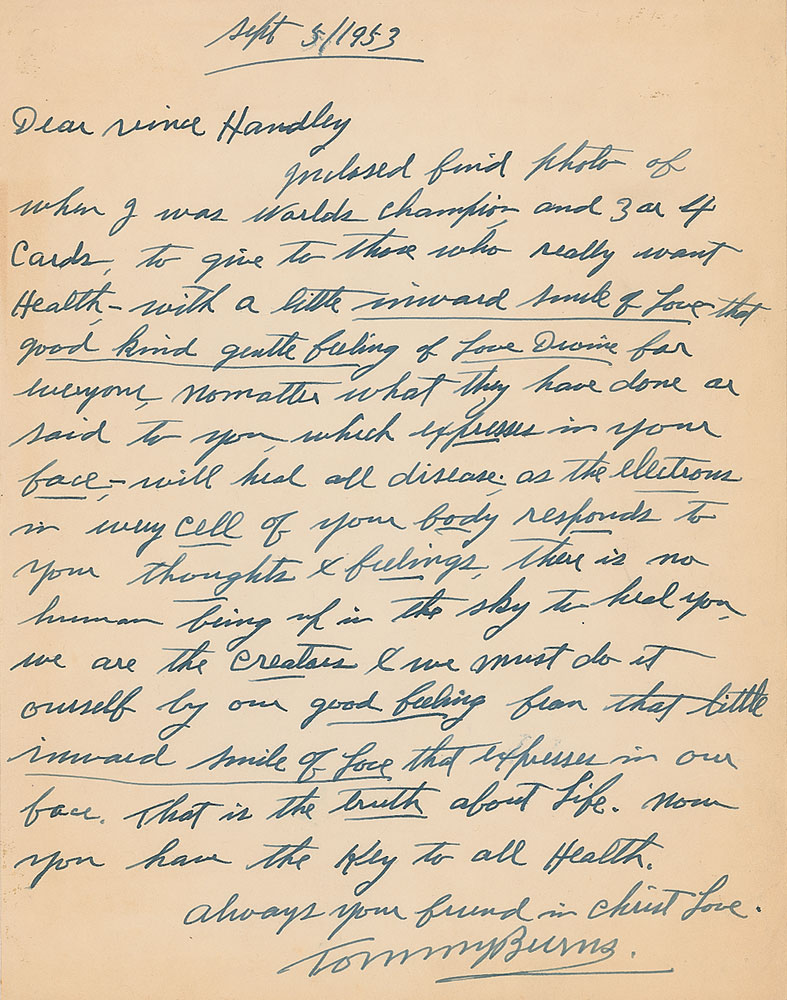 ALS, one page, 8.5 x 11, September 5, 1953. Letter to an admirer. In full (spelling and grammar retained): “Inclosed find photo of when I was worlds champion and 3 or 4 cards, to give to those who really want health—with a little inward smile of love that good kind gentle feeling of love divine for everyone, no matter what they have done or said to you, which expresses in your face—will heal all disease; as the electrons in every cell of your body responds to your thoughts & feelings, there is no human being up in the sky to heal you, we are the creators & we must do it ourself by our own good feeling from that little inward smile of love that expresses in our face. That is the truth about life. Now you have the key to all health.” In fine condition. Pre-certified Steve Grad/PSA/DNA and RR Auction COA.