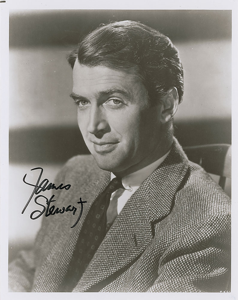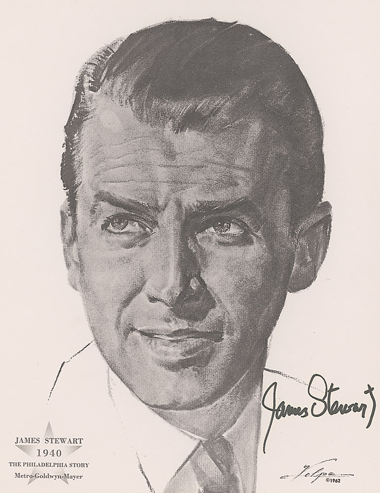 Two items: one Volpe print of Stewart, 8 x 10.5, signed in black felt tip, and one glossy 8 x 10 photo signed in black felt tip. In fine condition, with light corner tip dings to the photo. RR Auction COA.