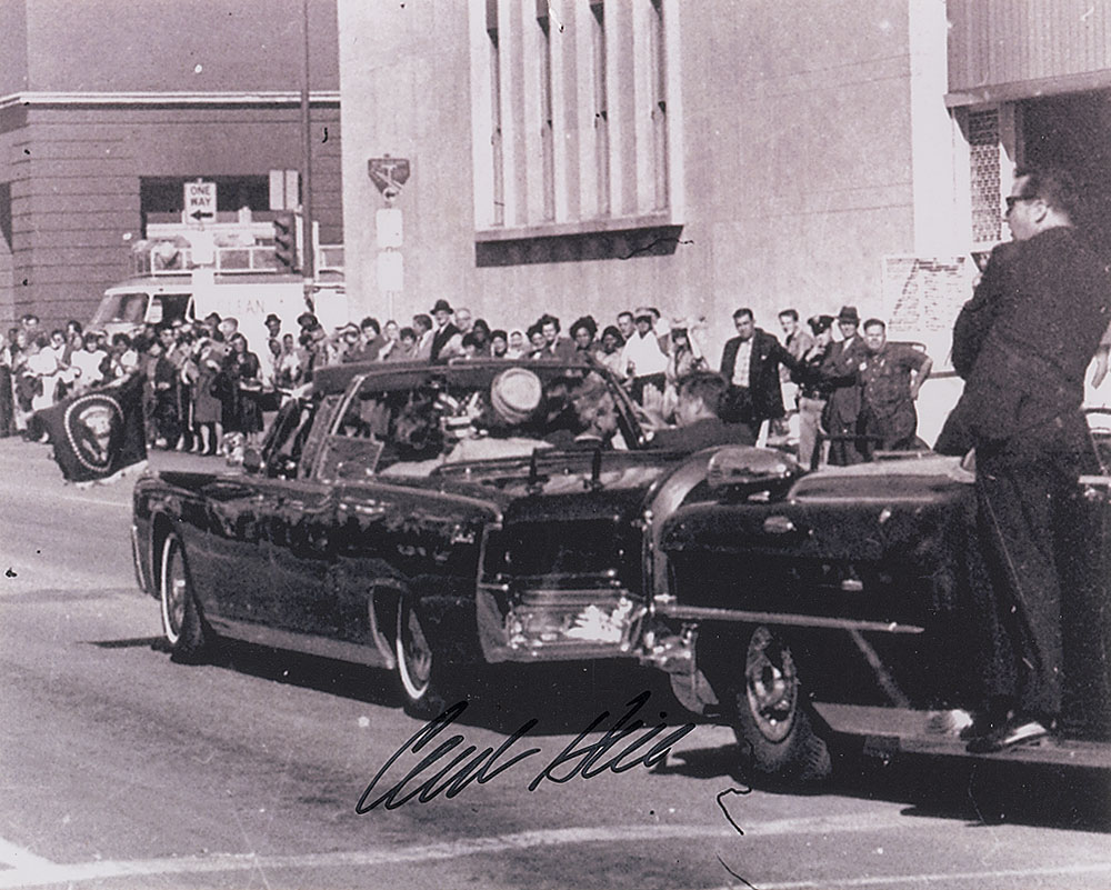 Satin-finish 10 x 8 photo of Agent Hill riding along the side of the car following President Kennedy moments before his assassination, signed in black felt tip. In fine condition. RR Auction COA.