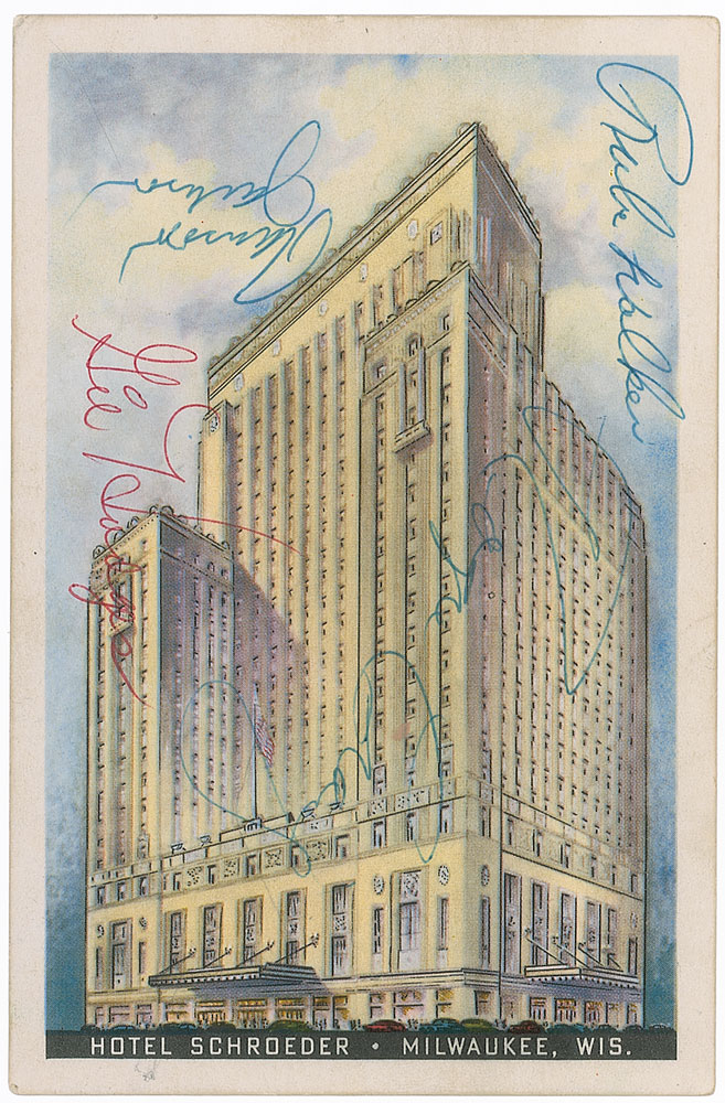 Vintage ballpoint signatures of 17 members of the 1956 Brooklyn Dodgers team on both sides of a 5.25 x 3.5 postcard depicting Milwaukee’s Hotel Schroeder. Signers on the reverse are Jackie Robinson, Roy Campanella, Sandy Koufax, Don Drysdale, Walter Alston, Clem Labine, Carl Erskine, Don Newcome, Don Bessent, Charlie Neal, Sal Maglie, Rocky Nelson, and Ken Lehman, and signed on the reverse by Gil Hodges, Rube Walker, Ransom Jackson, and Roger Craig. Notation to upper right corner indicates that the signatures were acquired on July 12, 1956, when the Dodgers played the Braves in Milwaukee. In fine condition. Pre-certified Steve Grad/PSA/DNA and RR Auction COA.