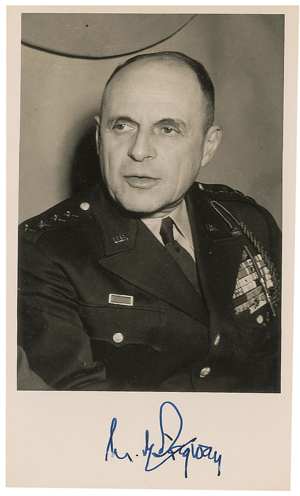 Vintage glossy 5 x 8.5 photo of Ridgway in uniform, signed in the lower border in fountain pen, “M. B. Ridgway.” In fine condition, with mild spotting to finish. Accompanied by the original transmittal letter from an assistant, dated March 23, 1954. RR Auction COA.