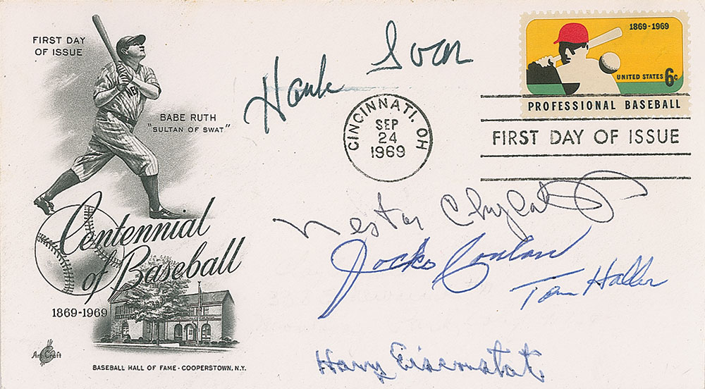 FDC with a cachet honoring the centennial of baseball, signed in blue and black ink by Nestor Chylak, Jr., Jocko Conlon, Hank Saur, Tom Haller, and Harry Eisenstat. In fine condition. Pre-certified Steve Grad/PSA/DNA and RR Auction COA.
