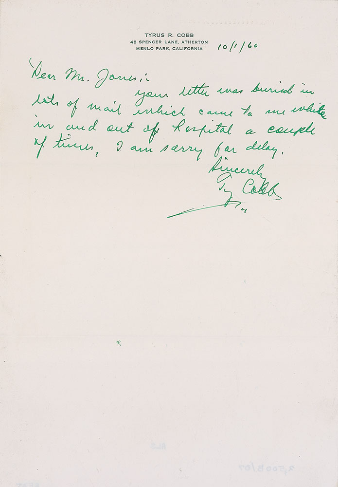 ALS, one page, 7.25 x 10.5, personal letterhead, October 1, 1960. Response to an admirer. In part: “Your letter was buried in lots of mail which came to me while in and out of hospital a couple of times, I am sorry for delay.” In fine condition. Pre-certified Steve Grad/PSA/DNA and RR Auction COA.