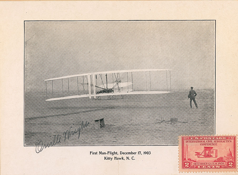 Uncommon and exceptionally desirable vintage 6.25 x 4.5 cardstock photo of the Wright Brothers’ first flight at Kitty Hawk, signed in fountain pen, “Orville Wright.” Captioned in the lower border, “First Man-Flight, December 17, 1903, Kitty Hawk, N. C.,” and bearing a two-cent US postage stamp honoring the International Civil Aeronautics Conference affixed to the lower right. Removably affixed to an off-white 8 x 10.5 scrapbook page also bearing images of the aviation pinoeer. An unobtrusive tear to the bottom edge (touching the caption but not extending into image), otherwise fine condition. Pre-certified PSA/DNA and RR Auction COA.