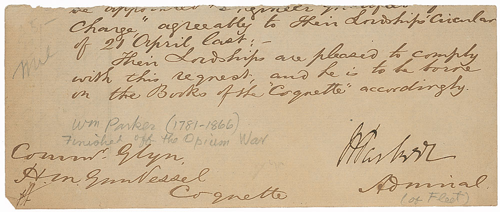 Royal Navy officer (1781–1866) known for serving during the First Opium War. Crisp ink signature, “W. Parker,” on an off-white 8 x 3.25 slip clipped from the close of a manuscript document. In fine condition. RR Auction COA.