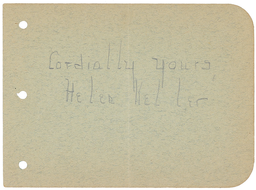 Vintage pencil signature, “Cordially yours, Helen Keller,” on a light green 6 x 4.5 album page. In fine condition, with a central vertical fold and some mild edge toning. Accompanied by a letter of authenticity from James Spence. RR Auction COA.