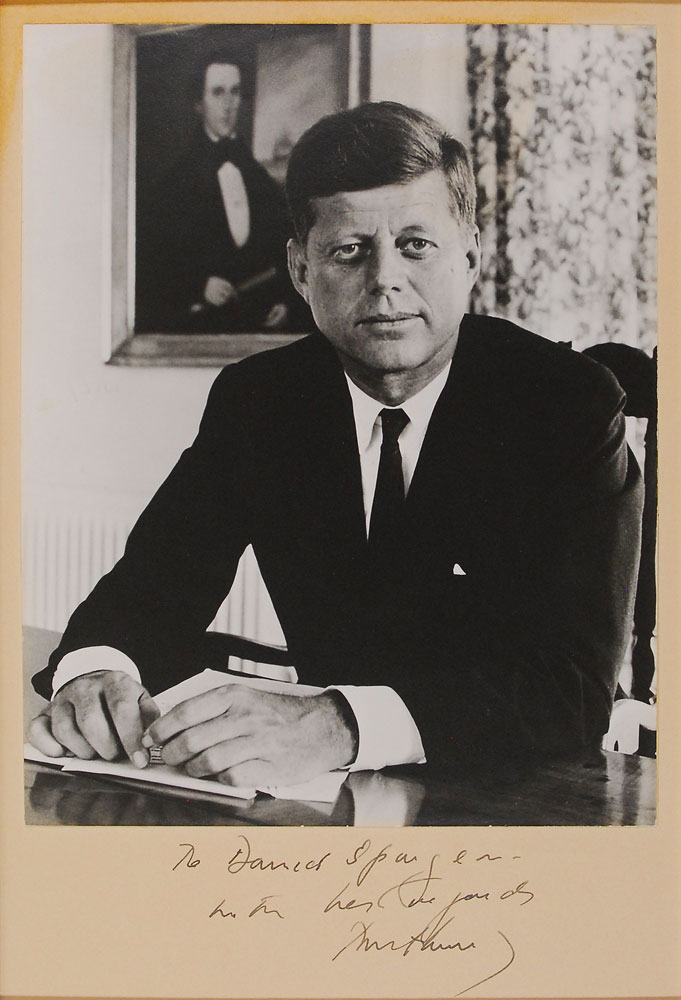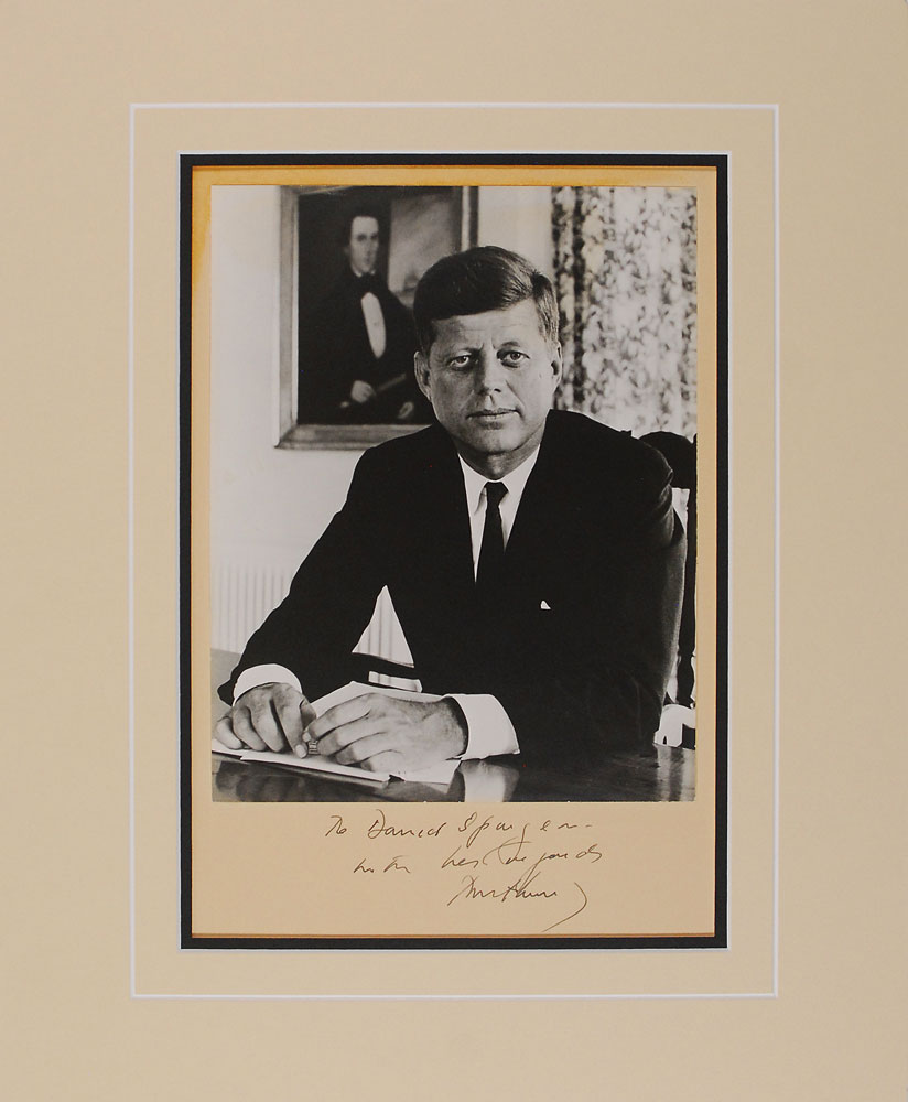 Vintage matte-finish 7.5 x 9.5 photo of Kennedy taken after being nominated as the Democratic presidential candidate in August of 1960, affixed to an 8 x 12 mount, signed and inscribed on the mount in fountain pen, most likely as president, “To David Spurgen—with best regards, John F. Kennedy.” Double-matted to an overall size of 14 x 17. In fine condition, with a couple of trivial creases to background. Although taken in the summer of 1960 by Alfred Eisenstaedt, this was the preferred portrait of Kennedy he signed and gave out during the beginning of his administration. Pre-certified John Reznikoff/PSA/DNA and RR Auction COA.