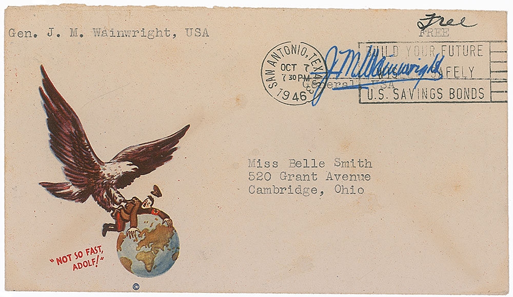 Free-franked mailing envelope with a patriotic anti-Hitler cachet, 6.5 x 3.5, franked in the upper left by Wainwright, “J. M. Wainwright.” Postmarked San Antonio, Texas, October 7, 1946. Some light areas of toning from envelope’s adhesive, and postmark over the signature (not affecting legibility), otherwise fine condition. RR Auction COA.
