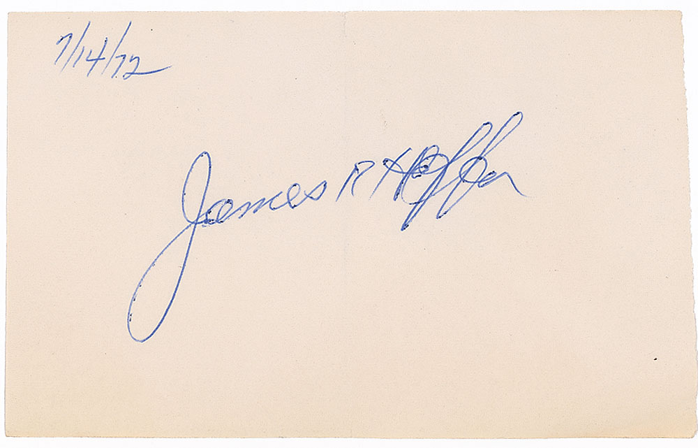 Ballpoint signature, “James R. Hoffa,” on an off-white 4.75 x 3 slip bearing a collector’s notation of July 4, 1972. In fine condition, with a central vertical fold (passing through his middle initial). RR Auction COA.
