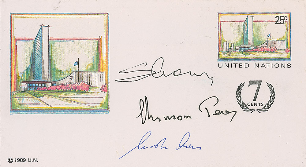 Commemorative cover with a cachet honoring the United Nations, signed on the front in blue and black ink by Shimon Peres, Yitzhak Shamir, and Moshe Arens. In fine condition. RR Auction COA.