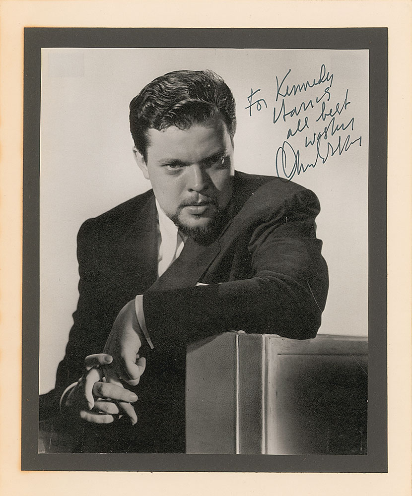 Outstanding 6.75 x 8.25 magazine photo of Welles in his younger years, nicely signed and inscribed in a light area in black felt tip, “For Kennedy Harris, all best wishes, Orson Welles.” Affixed to an 8.5 x 10.25 sheet. In fine condition. Pre-certified PSA/DNA and RR Auction COA.