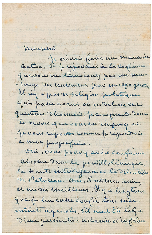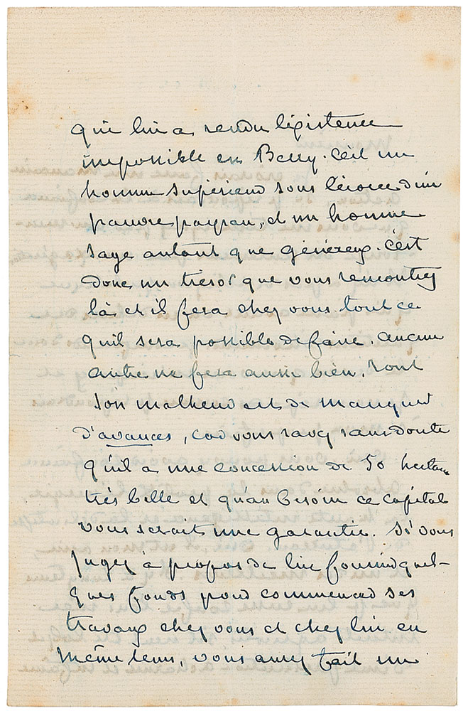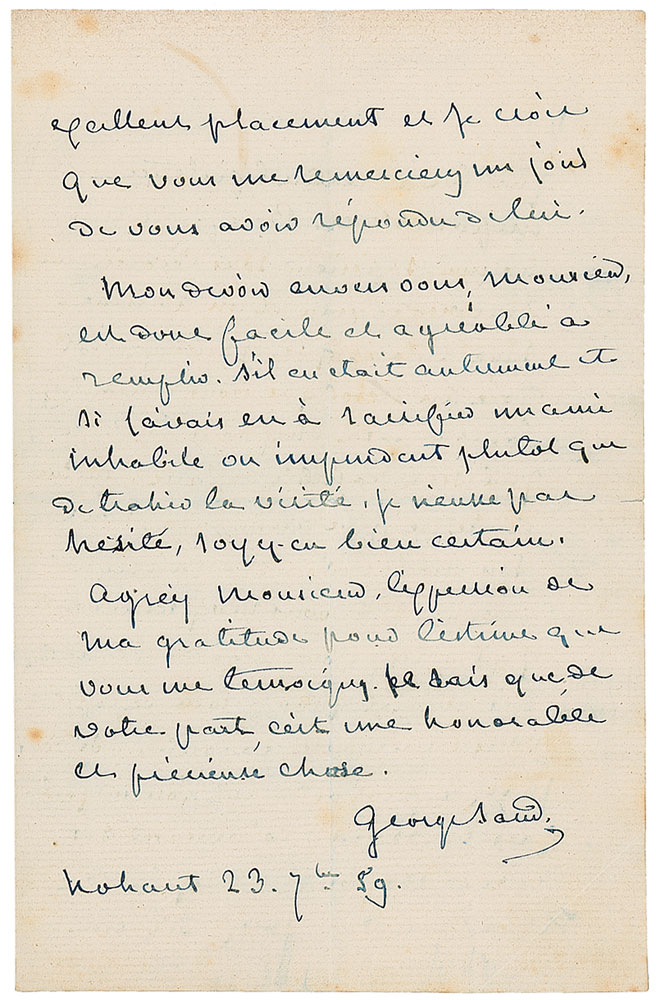 Eminent French author (1804–1876), born Amantine-Lucile-Aurore Dupin, better known by the masculine pen name she adopted early in her career. An early feminist, she also earned a footnote in musical history as the longtime romantic companion of pianist/composer Frédéric Chopin. ALS in French, three pages on two adjoining sheets, 5.25 x 8.25, personal letterhead, September 23, 1859. Letter to Jean-Baptiste Pégot-Ogier, former commissioner of the Republic and deputy from the Gers exiled for his opposition to Napoleon IlI’s coup d’état. In full (translated): “I think I would behave badly if I responded to the confidence you show me with a lie or an exaggeration. There is no political religion which takes precedence over or is outside of questions of honor. I therefore understand the duty which you impose on me and I’m answering you in the same way that I would reply to my own brother. Yes, you can have absolute confidence in Patureau’s probity, energy, great intelligence and tact. Yes he is my friend, and one of the best of them. I would long since have entrusted to him all my agricultural interests if he had not been the object of intense and infamous persecution which made life impossible for him in the Berry [district of France]. He is a superior man beneath the rough exterior of a poor peasant. He is also a wise and generous man. You will therefore find a treasure in him and he will do everything that can possibly be done at your place. Nobody else could do as well. His entire misfortune is that he lacks cash advances, because you undoubtedly know that he has a very fine land grant of 50 hectares and that if necessary this capital would be a guarantee for you. If you deem it suitable to make some funds available to him to start working at your place and at his own place at the same time, you will have made an excellent investment and I think that you will thank me some day for having guaranteed him to you. My duty towards you, Sir, is therefore easy and pleasant to do. If this had not been the case and if I would have had to sacrifice an unskillful or imprudent friend rather than to betray the truth I would not have hesitated. Be quite certain of that.” Central horizontal and vertical folds and some scattered light foxing, otherwise fine condition. Pre-certified PSA/DNA and RR Auction COA.